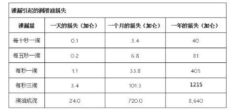 高壓;極端溫度;由振動(dòng)引起的零件疏松;密封件膨脹、收縮或磨損;其實(shí),潤(rùn)滑油慢慢往設(shè)備外漏的同時(shí),也在悄悄消耗著工廠的購(gòu)油經(jīng)費(fèi)。沒(méi)有具體概念的話(huà),您不妨看看數(shù)據(jù)了解隱藏在“小小”漏油現(xiàn)象背后的大損失。